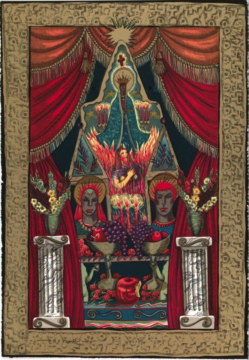 After Asco, Valdez stood out among Chicano artists for her focus on feminist themes. Her work frequently focuses on Chicana women’s status within society. In Forbidden Fruit, Valdez constructs a rich and dense image where female figures appear as precious jewels. Set in a golden frame, the composition is re-framed in an open red curtain.
